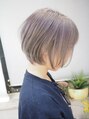アウトラインは上がり気味でウエイトを前下がりに落とした前下がりマッシュショート。2セクションと3セクションの組み合わせで丸みと動きの両立、さらに乾かしただけで仕上がるまとまりがでます。ダブルブリーチオンカラーでシルバーグレイをオン。