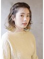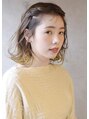 全体をブリーチ後、ミルクティーベージュのグラデーションにオンカラー。両サイドのもみあげ部分の毛先のみイエローのポイントカラーに。眉上のパッツン前髪、肩につくかつかないかのウルフボブにカット。