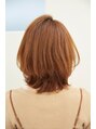 カットは肩上のローレイヤーボブ スタイル。全体的に重くなりすぎいないよう間を間引くように量をすきました。前髪は、リップラインでカット。コテで巻いた時にひし形になるように表面に段差を入れ簡単スタイリングスタイルに。小顔、大人ボブ