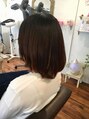 伸ばしかけミディアムスタイルですサイドは顎ラインに向かって前上がりで切り上げ顔回りをカバー。低めの段をいれ毛量調整して自然な丸みが出るようにしています