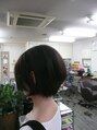 ショートボブ。ゆるいクセがあるので、アウトラインは大胆に不ぞろいにして、クセの動きをいかす。