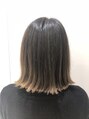 重めの前髪と毛先の切りっぱなしラインを揃えたモードなボブ。根元なダークグレーから毛先のライトアッシュベージュまでのグラデーションでポイントを