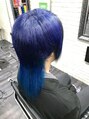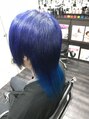 ブリーチ後、ウルフスタイルの上部分を原色の暗めブルー、襟足部分を原色の明るめブルーにさせていただきました。