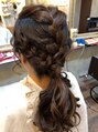 今回紹介するのは編み込みヘアセットです。編み込みを3個作ってからひとつにまとめます。最後に編み込みを少し指先で引っ張りだしてゆるいスタイルに。崩れにくく結婚式・2次会にピッタリです。