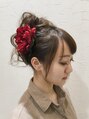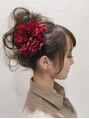 バングの艶感と揺れるカールチラシの正統派アップです。最後に大きめの髪飾りをバランス良く飾り付けました。