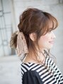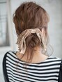 髪全体を波巻きで巻いて、おくれ毛を顔周りからバックにかけて少しずつ残して出し、低めにまとめた髪を軽くおだんごにまとめました。 髪飾りには、リボンのような柔らかめな素材のものを使うのがポイントです!!!!