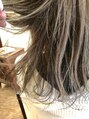 トップは細めのチップでそれ以外は不規則にハイライトをいれてそのあとにアディクシ-のサファイヤ(薬剤名)をのせちゃいました透明感があり 動きがでて いい感じ!