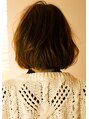 緩やかなくせ毛風ボブ内巻きパーマに表面のみ2回転パーマを入れ内巻きにもくせ毛風にもアレンジ出来る2面性ボブですアッシュカラーで柔らかな髪質も演出