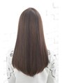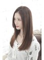 ゆるやかな前上がりのロングストレートスタイル。バングは分けて、艶々ストレートの毛先のみCカールを。カラーはアッシュベージュで透明感を表現。