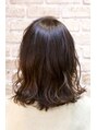 鎖骨ラインのローレイヤーベース。ダークカラーでツヤをキープしつつ、表面にレイヤーを入れて軽さを出しています。カールをミックスすることで髪も表情も柔らかく見せたスタイル。