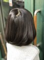 5歳の女の子のカットです。あどけなさを残せるように前髪は眉上2cm位で揃いすぎず。全体はあご少し下の重めのボブスタイルです。
