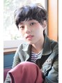 眉上バングからのマッシュショートにトップにふんわりパーマ、ヘアカラーは落ち着けて透明感のあるブルーアッシュ、お手入れ簡単ショートスタイルです。