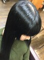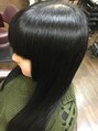毛先中心に、やや明るめのブラウンになっていた状態から、そこにブルーブラックとダークブラウンを1対1にブレンドしたカラーをのせました。カラー前とカラーのシャンプー前に、テラヘルツトリートメントで仕上がりサラサラです。。