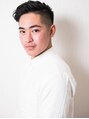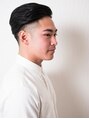 サイドを刈り上げたアシンメトリースタイル。トップは気持ち長めに残してオールバックに。