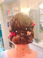 トップは波ウェーブとカチューシャ風の編み込みが可愛いアップスタイルです!パールピンとリボンでさらに立体感を出しています。