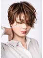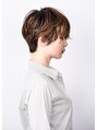 アンニュイな雰囲気のショートスタイルです。カラーはハイライトメイン。根元をあえて黒く残すのがポイントです。長めの前髪を強調するため、襟足は短く収めます。