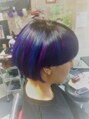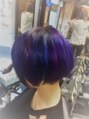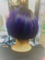 日頃、ショーケースやステージに立つことが多いゲスト様。変形アシメショートスタイル。ヘアカラーは根本をダークグレーにしてから、パープル系ブルー系のデザインカラー。いつもハイセンスなオーダーをありがとうございます。