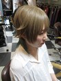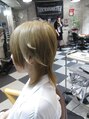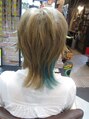 ブリーチ後アッシュミルクティーベースに右の襟足にターコイズブルーをポイントに♪カットはウルフベースで軽さを出しました。