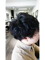 ツーブロックショートにスパイラルパーマをランダムにかけ、あらゆる方向に重なりあうように動く毛束が、軽やかでソフトなニュアンスを演出。パート分けしたり、アップバングにしても決まるアレンジ力の高いヘアスタイル!