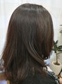 お客様のゆるくうねるくせ毛をいかしてスキばさみを入れずに毛先をそろいすぎないように動きを出すドライカットで仕上げました。似合わせで5~7cmほどカットしました。カラーはサイドにローライトを入れて伸びても目立たないようにしています。