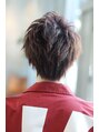 マッシュでもできるアップバングショート!全体にMIXパーマを施すとよりスタイリングが楽になります!カラーは9トーンのショコラグレージュ