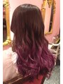 グラデーション部分のブリーチ1回以上必須出来れば2回、バイオレットレッドのカラーで毛先はカラー、残りはアッシュブラウンで、毛先整えてランダム巻き