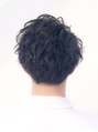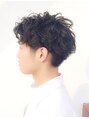 全体にソフトスパイラルパーマでウェーブ感を出したアップバングショート☆前髪はかきあげるようにあげてスッキリ男前に!スタイリングはグリースかワックスを全体に馴染ませるだけでOKです☆