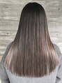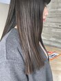パツッとブラント感残るストレートロングスタイル。カラーは、シアーなグレーアッシュカラーで透明感を。