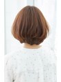 カットはあご下のひし形ナチュラルボブ スタイル。全体的に重くなりすぎいないよう量をすきました。前髪は、眉が隠れる位置でカット。コテで巻いた時にひし形になるように表面に段差を入れ簡単スタイリングスタイルに。似合わせカット、小顔、大人ボブ