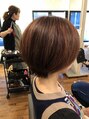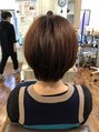 後頭部に丸みが出るように襟足はすっきり切りトップを重みを残して切り剥きで毛量調整しすっきりまとめたスタイルです前下りのラインが顔回りをすっきり見せてくれます
