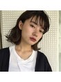 肩につくくらいのミディアムレングスのボブスタイル。トップから大きくパーマをかけて外ハネ風に。カラーはハイライトを入れてアクセントにしてます。カジュアルなスタイルに合うスタイルです。