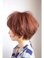 ショートボブのスタイルにカールアイロンで毛先にのみ動きにかけた外ハネのスタイルです。カラーは8トーンのローズピンクブラウンでツヤ感のある赤系カラーをチョイス。