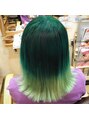 メロンクリームソーダカラーにトリプルカラーをして、赤味を完全に抜いてミドリのカラーをのせて、毛先はほんのりいれる