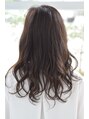 動きの出やすいカット(スライドカットなど)をすると、コテで巻いた時でも、束感が出やすくなります。かき上げるスタイルのロングヘアに、動きをプラスすると、少し「抜け感」のある大人ロングになります。カラーは、落ち着いた「アッシュピンク」で上品に。