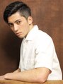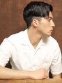 アウトラインを短く刈り上げたショートスタイルです。サイドパートでパートラインを作り、横に流せるようにトップはやや長めに切ります。逆側はパートラインまで短くカットし、短い所とトップとの長短をつけてメリハリのあるスタイルにしています。