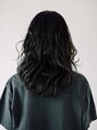 前髪流しのセミロングパーマスタイルです。グレージュ系カラーでカジュアルやクールなイメージに。暗めだけど透け感のある不思議なカラーです。パーマは大きなロッドでしっかりとかけます!