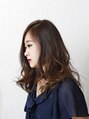 前髪が長めのレイヤースタイル。大人っぽい雰囲気を引き出せるように、少し落ち着いたトーンのグレイアッシュのカラーに、緩すぎないランダムウェーブを付けています。