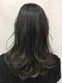 胸上でカットしたローレイヤーベース。眺めの前髪からつながるレイヤー4を顔まわりに入れていくと、セミディレンのゆるめカールウェーブが完成!カラーは透け感のあるカーキグレージュが決め手。サイドの内側の髪は耳にかけると◎