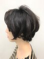 前下がりショートボブ、鼻位置でレイヤーを入れて軽さを表現。全体にパーマをかけて柔らかさを出し、8トーンのハニーブラウンで優しく仕上げます。ショートボブのパーマ初心者にオススメ。