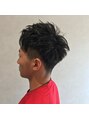 両サイドツーブロック、襟足刈り上げ、前髪を上げてアップバングにした爽やかでクールなメンズスタイルです。バリカンを使わず刈り上げることで、手触りがやわらかく、一週間でも長くもつカットを心掛けてます。