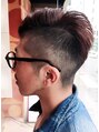 アシンメトリーなツーブロック。左サイドは3mmで刈り上げ、反対の右サイドは髪の毛でかぶって隠れるように。バックは自然につなげて立体感を出しています!カラーリングは刈り上げ部分とtopで分けています。