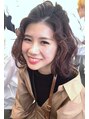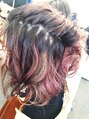 カラーをアッシュとピンクで動きを出しましたわざと根元は暗めで奥行きを出して、元気な感じを演出。ポイントはクルクルのバング!!