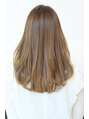 前髪なし、セミロングのパーマスタイル。アッシュ系カラーにハイライトのデザインカラーをしています。トップにボリュームを出しづらいセミロングやロングのスタイルはパーマをすることでふわっとしたボリュームが出せるのと毎日のスタイリングが楽になります