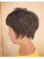 前下がりのショートボブスタイル。襟足はスッキリとさせ、前髪は短めの顔周りはレイヤーをいれ顔周りを補正。髪のクセをいかして、ゆるふわなスタイリング。