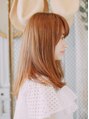 胸上の位置にカットし少し段を入れて毛先を柔らかくしたAラインのスタイルに!バングも目にかかるくらいの少し長めで流すことにより大人可愛い雰囲気に!厚みのあるスタイルなので明るめのカラーで軽さと抜け感を表現♪