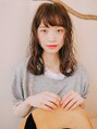 胸上レングスのIラインシルエットスタイル。ランダムに巻くことで華やかさが増します!!前髪は眉ラインのフルバングで巻くと眉が見え隠れするのが愛らしい◎カラーはぱっと見た感じ暗髪ですが光にかざすと明るくTシャツスタイルにも良し!!