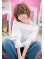 前下がりボブにゆるやかなニュアンスカールをつけることで、丸みあるフェミニンなシルエットに。トップからおろした厚めの斜めバングで小顔対策&目力強調。ちょっぴり残した外ハネでポップな印象に。カジュアル&フェミニンなラブマッシュショートです。