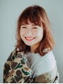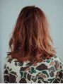 ひし形シルエットのミディアムスタイルです。カラーはオレンジベージュ、パーマは全体にゆるくふわっとカールをつけ、前髪は流せるよう方向づけをします。