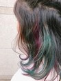 インナーハイライトにグリーンとパープルの2色で色味を入れていきました☆単色より色感が強いですがインナーなので髪をおろすと、そこまで派手すぎません☆