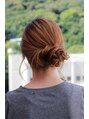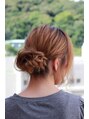 長さは肩下のミディアムぐらいです。首元をすっきりあげたお呼ばれアレンジです。